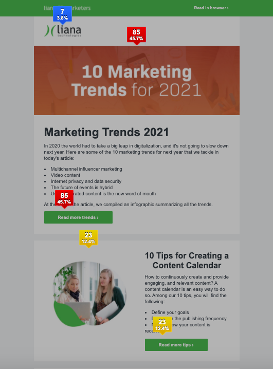 We use the heatmap feature of our email marketing tool LianaMailer for our newsletters to find out which links get clicked the most. The tool allows you to assess whether your CTA is clear enough, or if it seems to get lost between the other elements of the newsletter.