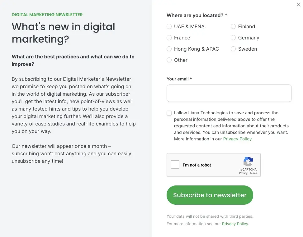 Use your sign-up form also for segmenting purposes. Collect location data to personalize your emails with the right content, language, and timing for each subscriber.
