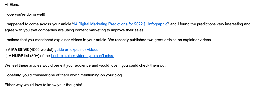 Publishing high-quality content is only half of your SEO journey. The next step is to reach out to relevant people to promote your articles and earn backlinks. The two most effective ways of outreach are: