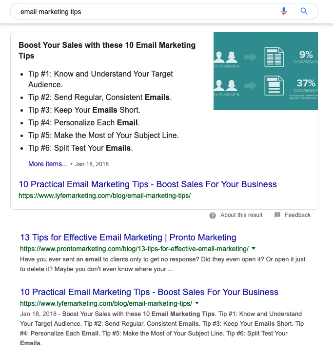 Featured snippets are selected search results that are featured on top of Google's organic results below the ads in a box. Like this: