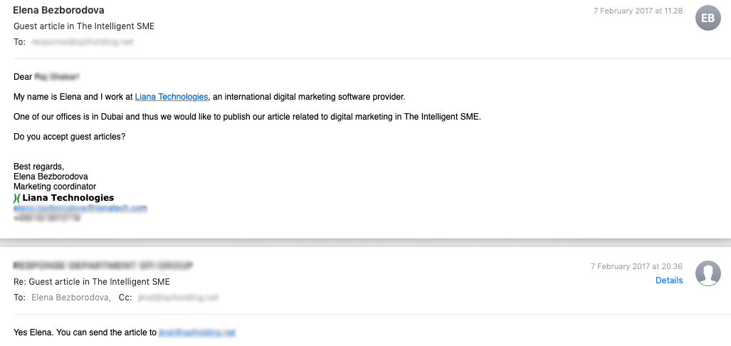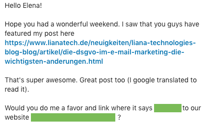 In case you receive a request like the one above, you can always take advantage of it. Simply ask to share your article on social media given that you add their link. This is exactly what we asked.
