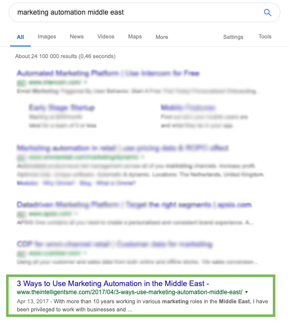 As a result, if you Google "marketing automation Middle East", you will find our article on the first organic results position: