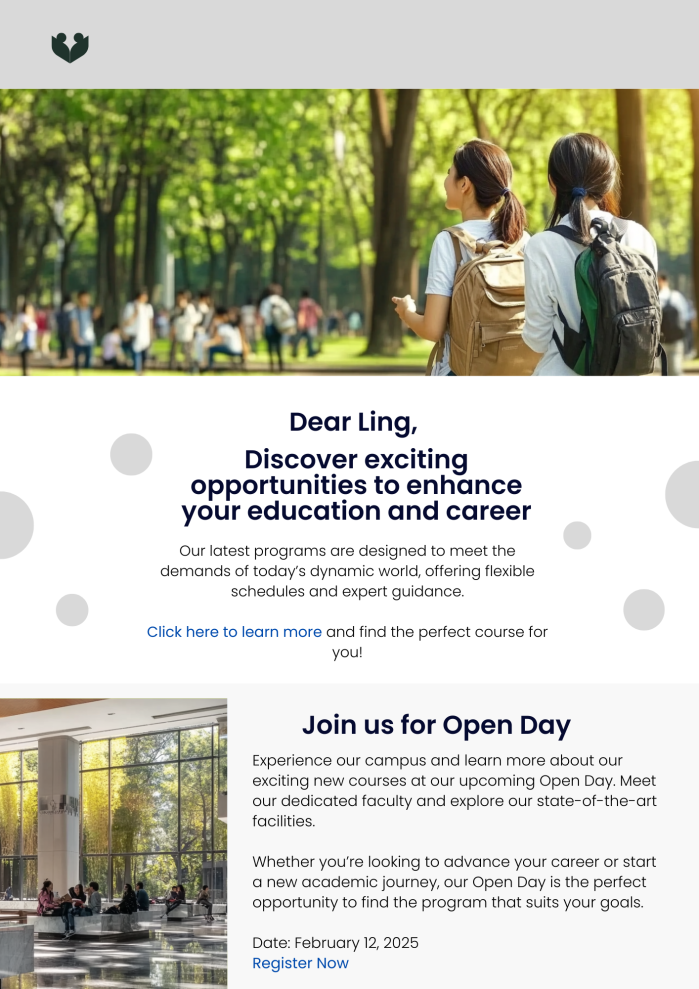 - Event reminders and registration follow-ups: Automated emails for open days, webinars, and information sessions can keep prospective students engaged without overloading your marketing team.