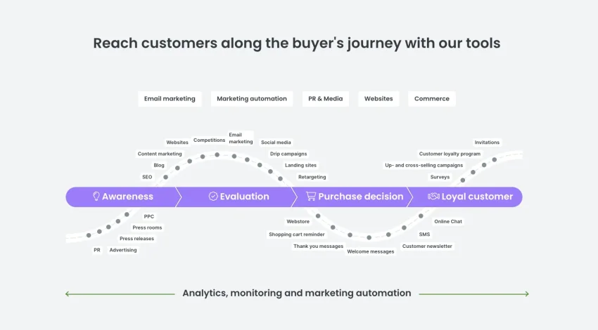 When each touchpoint and channel is actively measured, the customer’s journey toward making a purchase generates several data points that can be used to improve communication and marketing. The insights from analytics can also be transferred to sales or a CRM system.