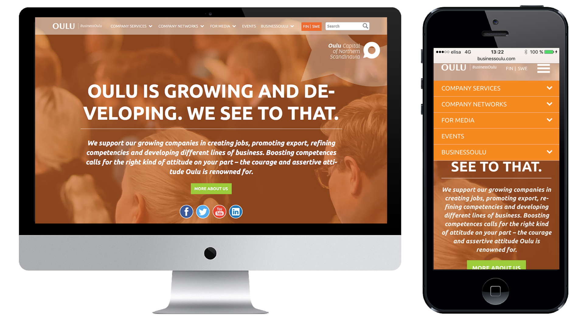 Business Oulu has an integrated a search function next to the main menu. On mobile devices the menu can be accessed with a button.