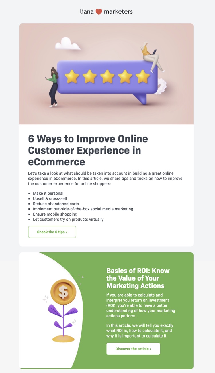 By sharing customer reviews and results in your newsletters, you’re showing your potential customers what they could gain from using your product or service – or what they’re possibly missing compared to their competitors, when they don’t use it.
