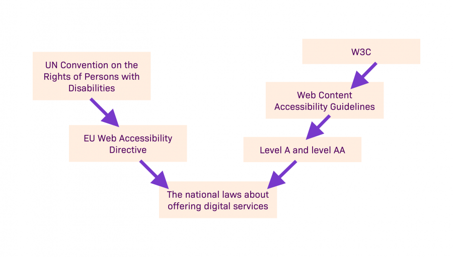 The directive and the individual laws are based on the United Nations Convention on the Rights of Persons with Disabilities (CRPD). Basically the laws obligate those concerned to comply with the WCAG level A and AA criteria. The organization behind the WCAG (Web Content Accessibility Guidelines) is W3C which maintains WWW recommendations.