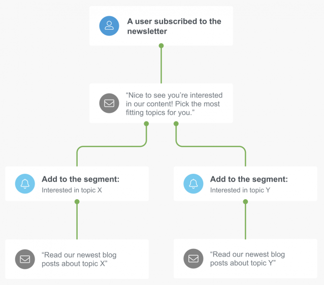 When you get a new newsletter subscriber, the message chain for this brand new person should most definitely be automated. You can first thank the new subscriber with special offers, then segment the recipients according to their behavior, and then modify the content of the following messages based on the data you have gotten. In other words, you form groups of the recipients according to what they are most likely to buy. These formed groups can later be used as target groups for manually sent messages.