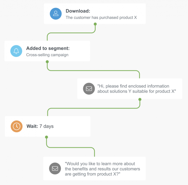It makes sense to send cross-selling drip campaigns utilizing marketing automation. All you need is a customer list or a specific segment to which targeted messages are sent as an automation chain, offering other products or services related to their previous purchase history.