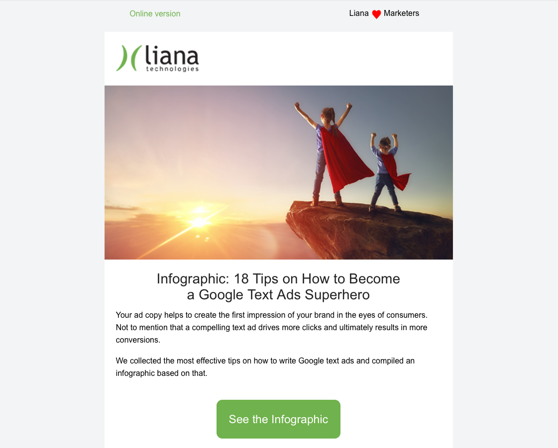 Liana Technologies utilizes infographics in support of and to sum up articles. Infographics are a great way to get traffic from your newsletters to your blog or your site.