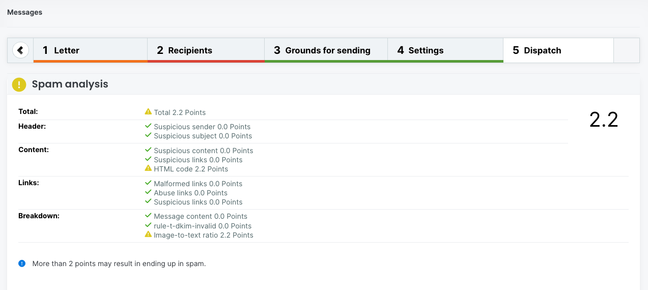 LianaMailer displays a spam analysis before sending the letter and tells you if your newsletter contains anything that could classify it as spam.